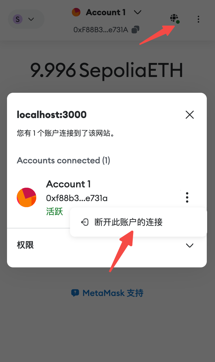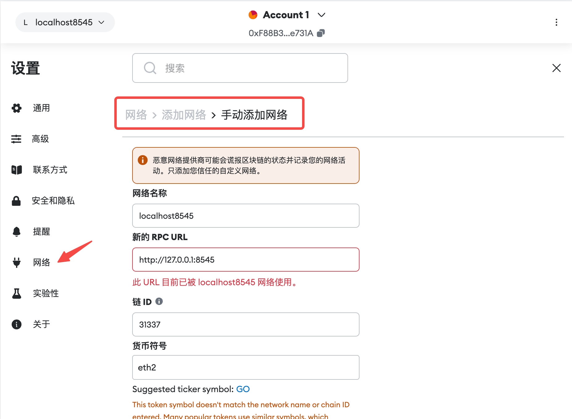 - 首先第一步一定要先在metamask 上面添加自己的本地网络,并切换过来, ethers 组件的以当前插件所在区块链网络为主